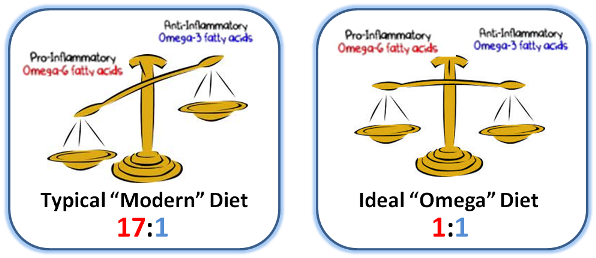 Just one of the examples discussed in this ebook relates to the Omega-6 to Omega-3 fat ratio found in the typical "modern" diet.  The ideal ratio is 1-to-1, but the typical modern diet contains a 17-to-1 ratio (17 times more Omega-6 fats than Omega-3 fats).  Omega-6 fats CAUSE inflammation and Omega-3 fats PREVENT inflammation.  Here it is represented graphically: